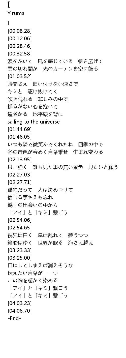| [03:46.71] | 「アイ」と「キミ」繋ごう |