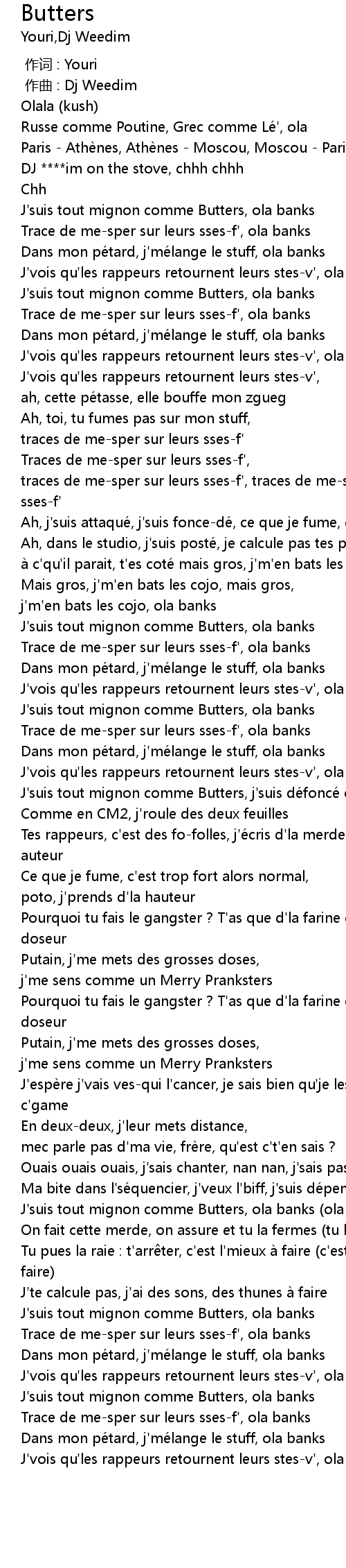 | [00:13.61] | J'suis tout mignon comme Butters, ola banks |