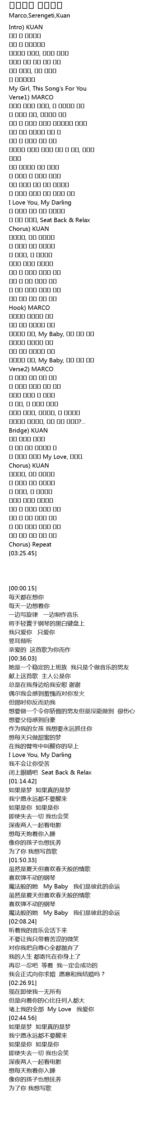 | [01:54.94] | 마법같은 그녀, My Baby, 우린 서로 운명 |