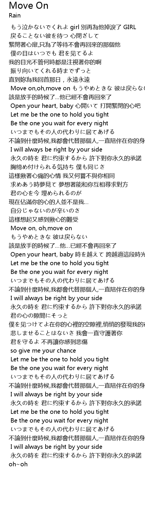 | [00:36.00] | Move on,oh,move on もうやめときな 彼は戻らない 該是放手的時候了...他已經不會再回來了 |