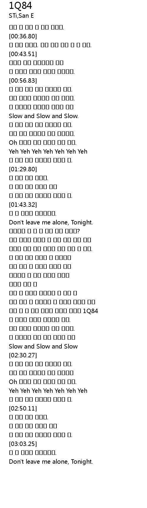 | [02:14.33] | 해가 뜰 때 까지 있어줘 믿어줘 비춰줘 1Q84 |
