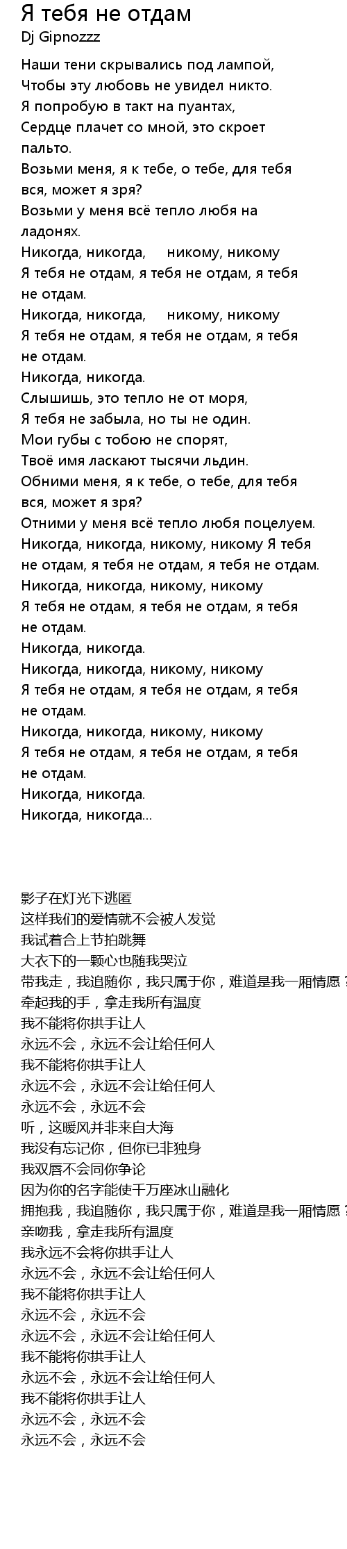 | [01:46.18] | Никогда, никогда, никому, никому Я тебя не отдам, я тебя не отдам, я тебя не отдам. |