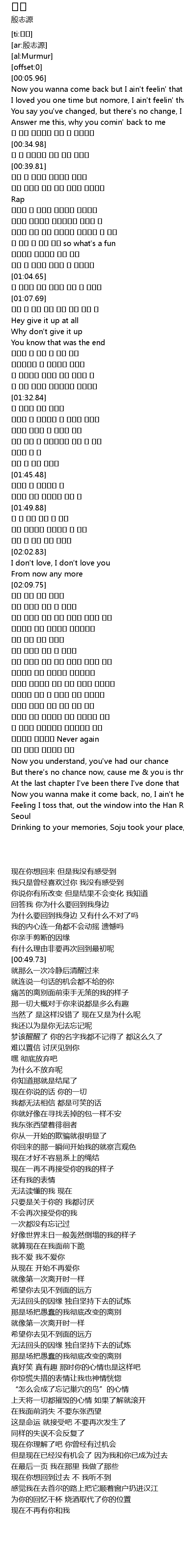 | [03:24.62] | Drinking to your memories, Soju took your place, nomore you me |