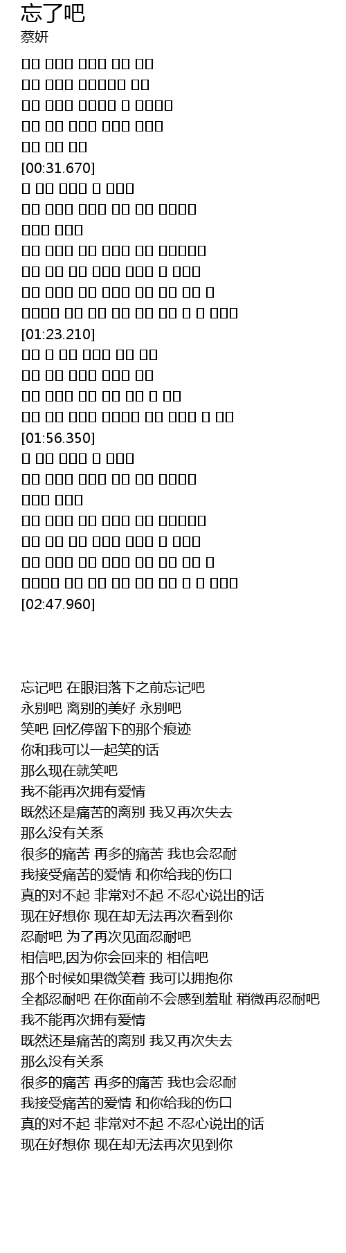 | [00:01.630] | 忘记吧 在眼泪落下之前忘记吧 |
