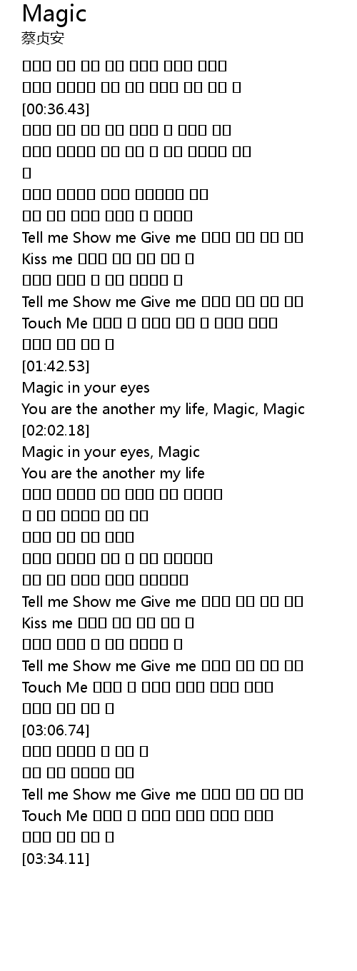 | [03:20.48] | Tell me Show me Give me 열리는 깊은 너의 눈빛 |