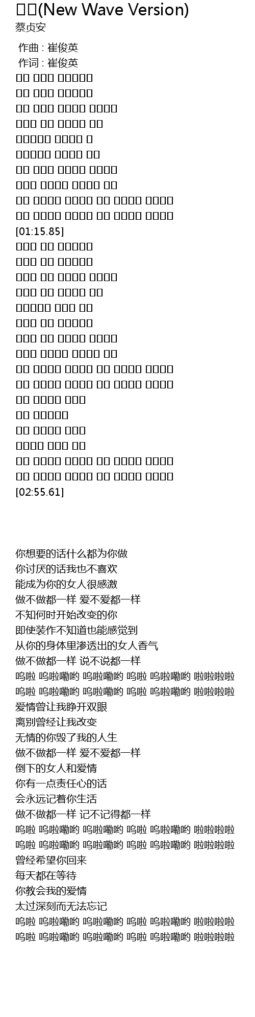 | [01:54.90] | 做不做都一样 爱不爱都一样 |