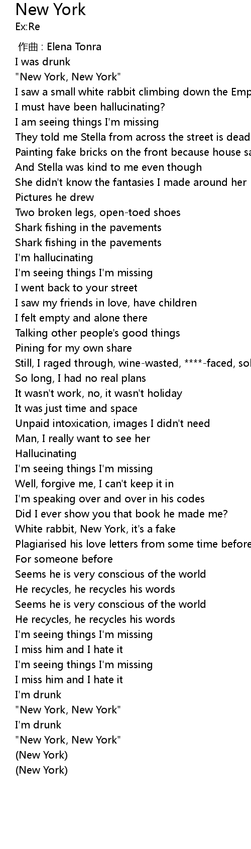 | [00:33.35] | I saw a small white rabbit climbing down the Empire State |