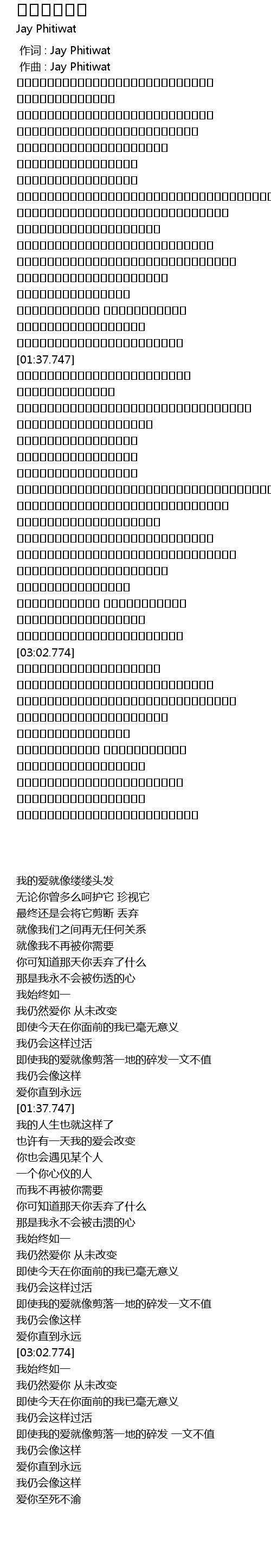 | [03:37.245] | แค่เพียงความรัก ที่ไม่มีค่า เหมือนเศษผม |