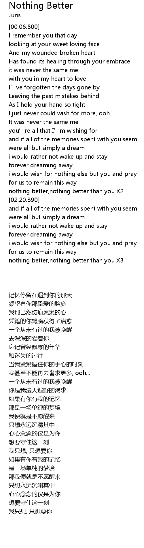 | [02:01.490] | nothing better, nothing better than you X2 |