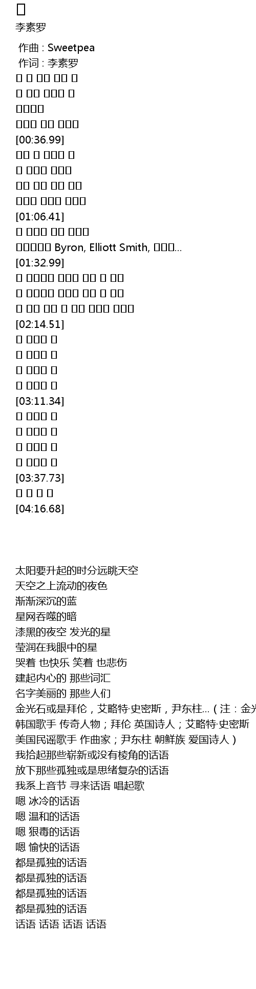 | [01:21.32] | 金光石或是拜伦,艾略特·史密斯,尹东柱...(注:金光石 韩国歌手 传奇人物;拜伦 英国诗人;艾略特·史密斯 美国民谣歌手 作曲家;尹东柱 朝鲜族 爱国诗人) |