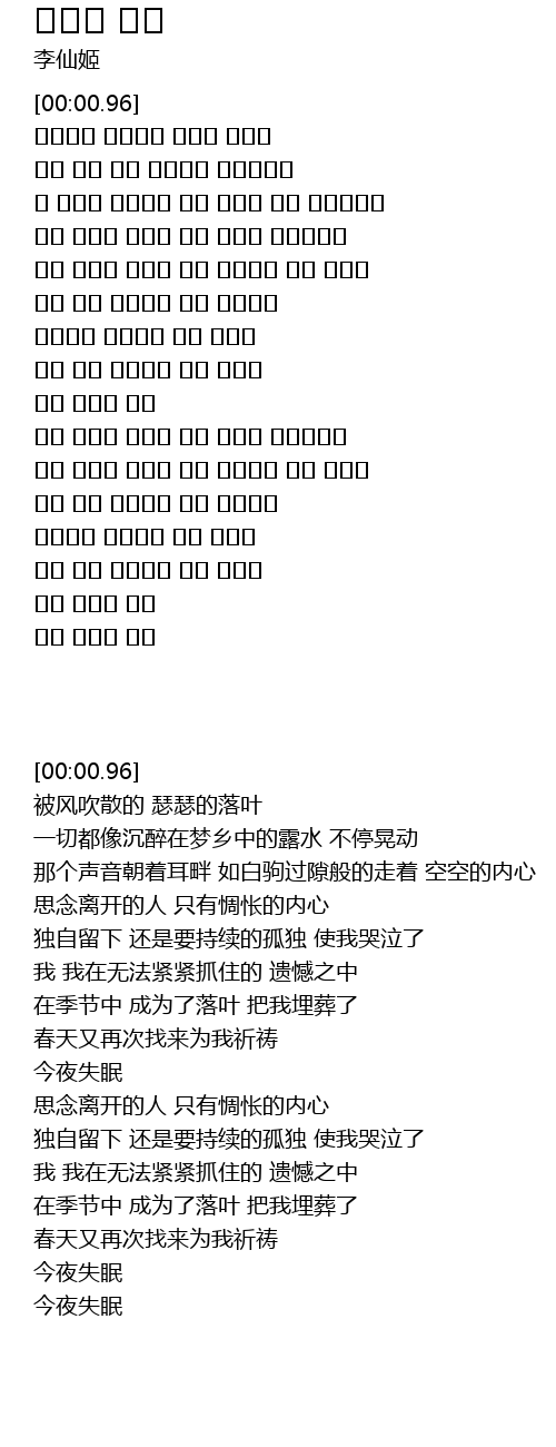| [00:35.96] | 바람불면 흩어지는 쓸쓸한 낙엽이 |
