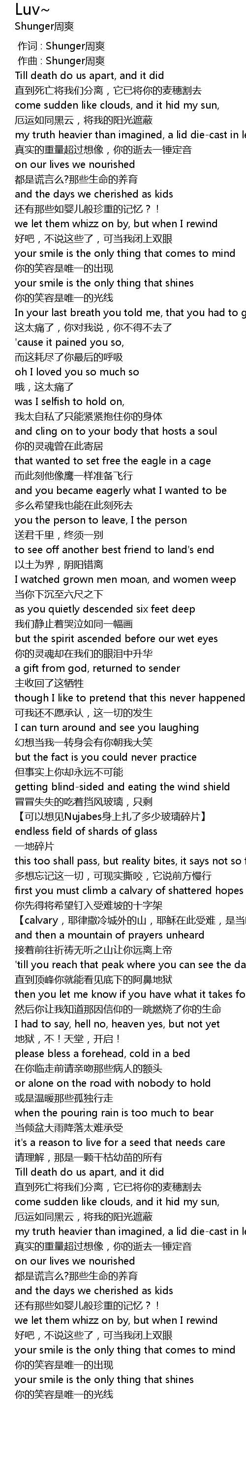| [00:00.000] | zuo ci : Shunger zhou shuang |