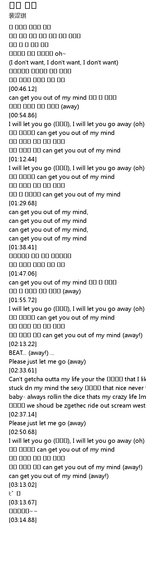 | [03:03.57] | 나를 달래지 말아 can get you out of my mind (away!) |
