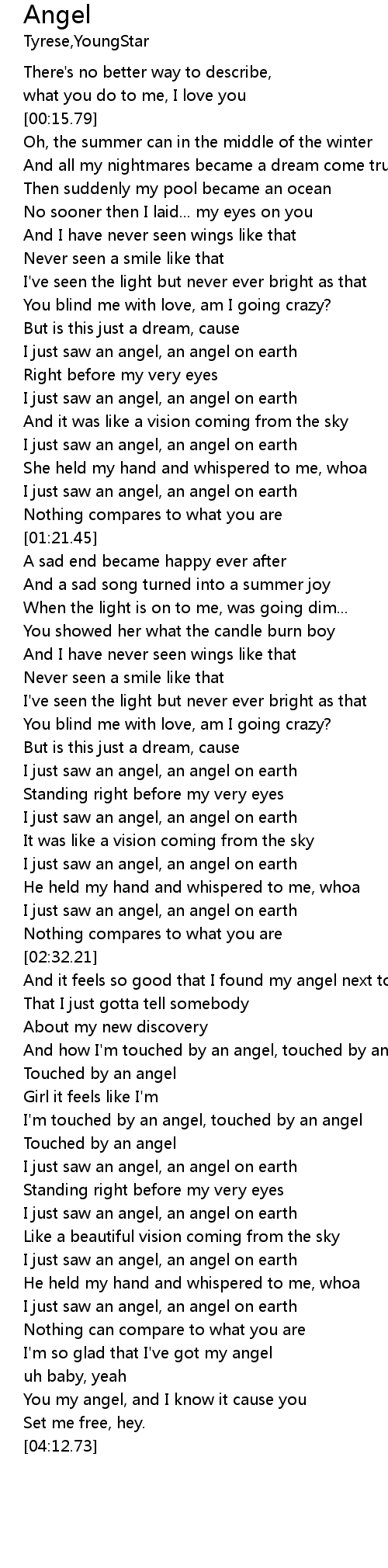 | [03:19.96] | I just saw an angel, an angel on earth |