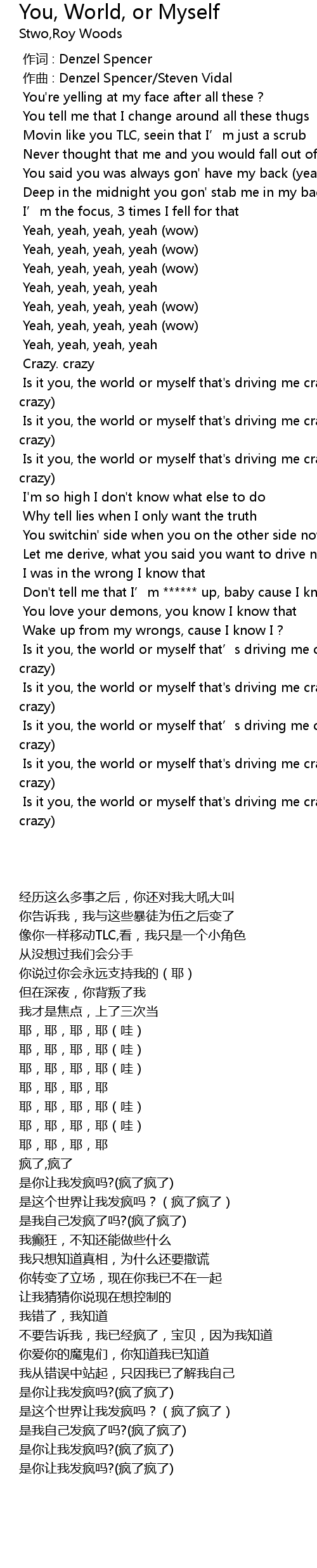 | [01:40.519] | Is it you, the world or myself that' s driving me crazy crazy, crazy |