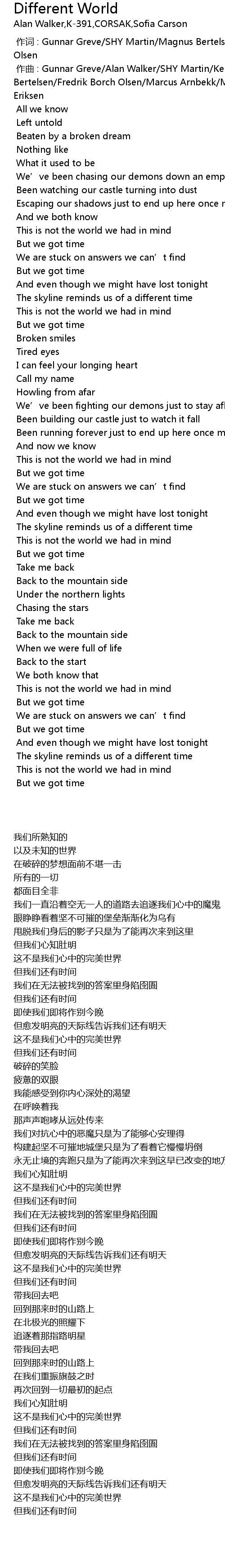 | [00:01.000] | 作曲 : Gunnar Greve/Alan Walker/SHY Martin/Kenneth Nilsen/Magnus Bertelsen/Fredrik Borch Olsen/Marcus Arnbekk/Mengzhou Hu/James Daniel Njie Eriksen |