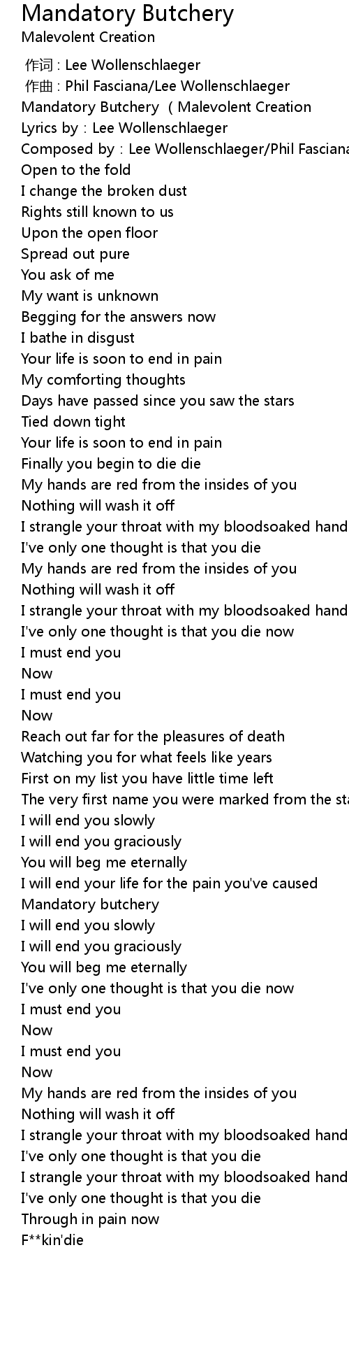 | [00:00.369] | Mandatory Butchery Malevolent Creation |