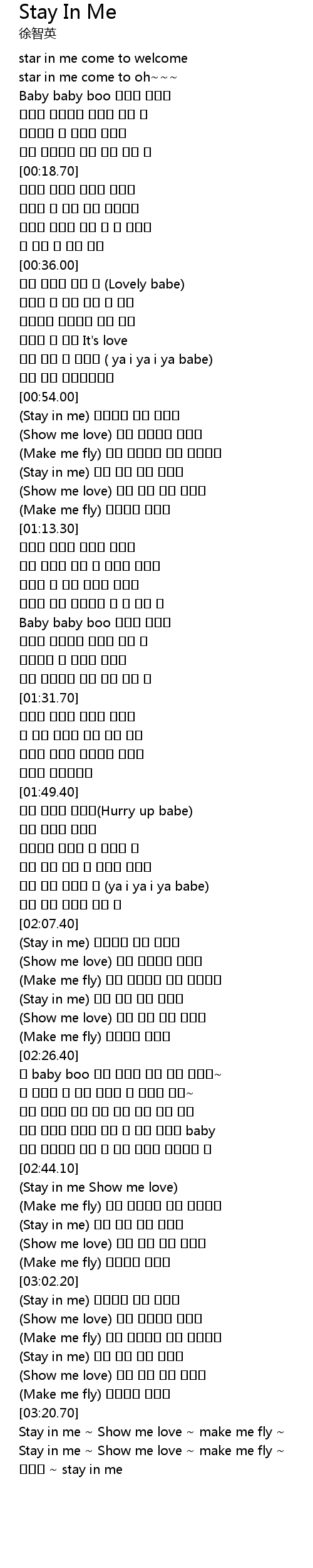 | [03:21.70] | Stay in me Show me love make me fly |