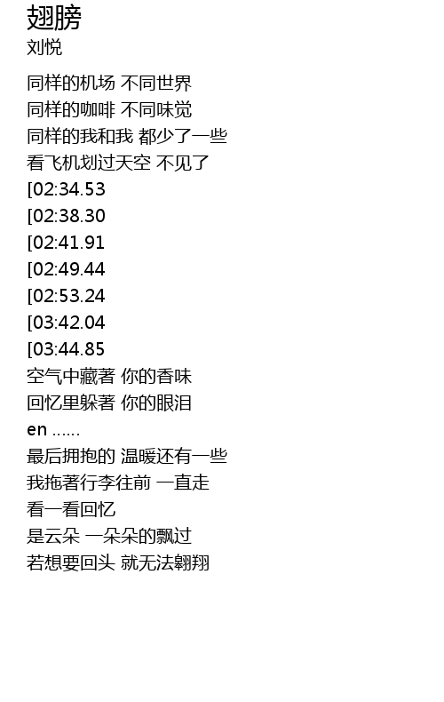 | [03:19.76][02:34.53][00:56.79] | 用你给我的翅膀飞 |