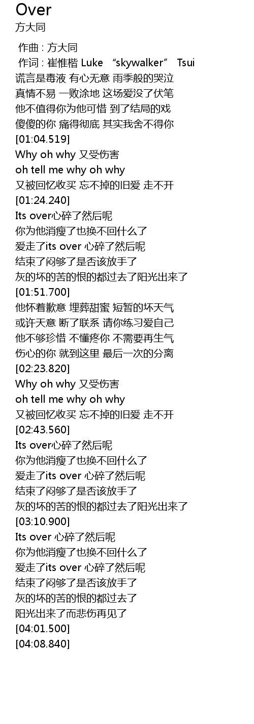 | [03:31.560] | Its over 心碎了然后呢 |