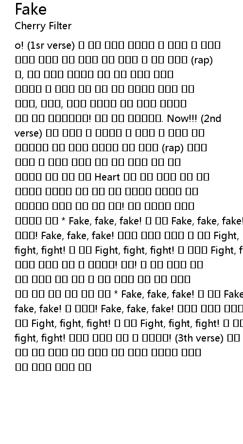o! (1sr verse) 뭘 자꾸 바라는 어린이여 네 욕심과 네 욕망을 채우라 두려움 없이 내게로 오라 화장을 해 잿빛 입술로 (rap) 오, 그래 어른이 되버리고 싶어 나의 화사한 미소를 비춰주는 내 방안의 맑은 거울 나를 지켜보네 우윳빛 거울 도톰히, 유난히, 입술이 아름다운 나의 모습을 기뻐하라 거울 속에 빨려들어갔다! 모든 것이 변해버렸다. Now!!! (2nd verse) 네가 원한건 다 가졌잖아 네 영혼과 네 순결을 바쳐 행복할꺼란 말은 안했어 입다물어 니가 원했어 (rap) 그렇게 바라던 내 모습이 되었나 나는 전혀 기쁘지 않아 되려 찌그러진 나의 상상 나의 Heart 전혀 정말 기쁘지 않아 정말 미워하고 증오하고 나는 당해 이런 세상들의 가면들에 나는 약해쓰러져 그들의 발을 핥고 있다! 이젠 거울밖의 아이로 돌아가고 싶다 * Fake, fake, fake! 뭘 원해 Fake, fake, fake! 왜 사기쳐! Fake, fake, fake! 꿈꿨어 지쳐간 세상이 날 찼어 Fight, fight, fight! 뭘 바래 Fight, fight, fight! 왜 앗아가 Fight, fight, fight! 꿈꿨어 지쳤어 이제 난 나가고파! 아아! 내 안에 사라진 너를 반겨 다시는 울지 않게 내 안에 사라진 너를 반겨 다시는 울지 않게 어린 날의 나를 반겨 * Fake, fake, fake! 뭘 원해 Fake, fake, fake! 왜 사기쳐! Fake, fake, fake! 꿈꿨어 지쳐간 세상이 날 찼어 Fight, fight, fight! 뭘 바래 Fight, fight, fight! 왜 앗아가 Fight, fight, fight! 꿈꿨어 지쳤어 이제 난 나가고파! (3th verse) 거울 앞에 나와 마주쳐 노란 머리와 빨간 입술이 아름다워 어울려 이제 눈물은 눈물은 거둬 |