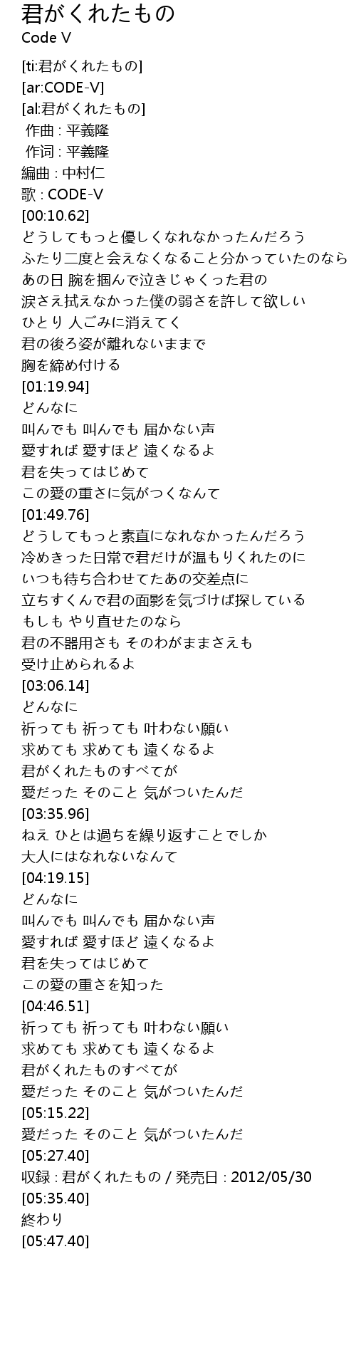| [05:30.40] | 収録∶君がくれたもの/発売日∶2012/05/30 |