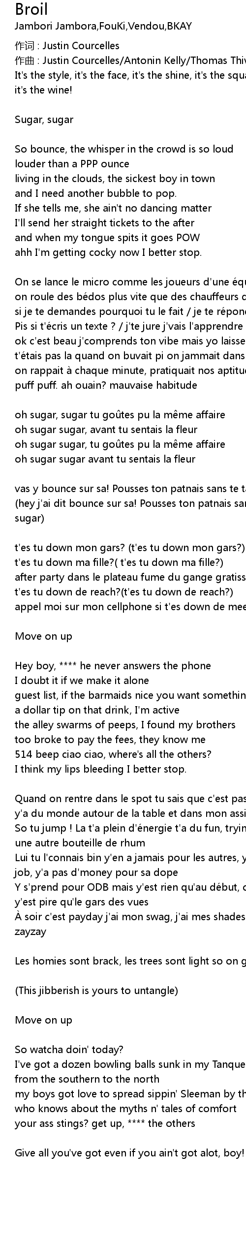 | vas y bounce sur sa! Pousses ton patnais sans te tanner c' est ton brown sugar hey j' ai dit bounce sur sa! Pousses ton patnais sans te tanner c' est ton brown sugar | |