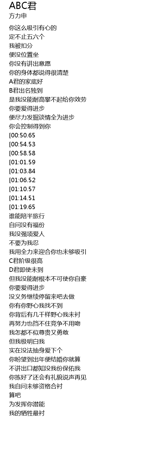 | [02:03.83][01:03.84] | 实在没法抽身爱下个 |