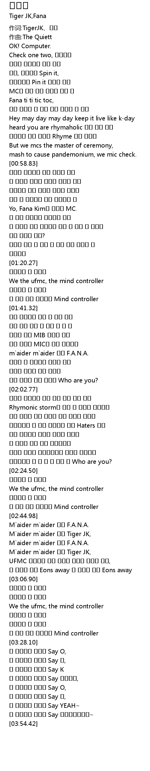 | [01:36.13] | 니 맘을 이미 움직이는 Mind controller |