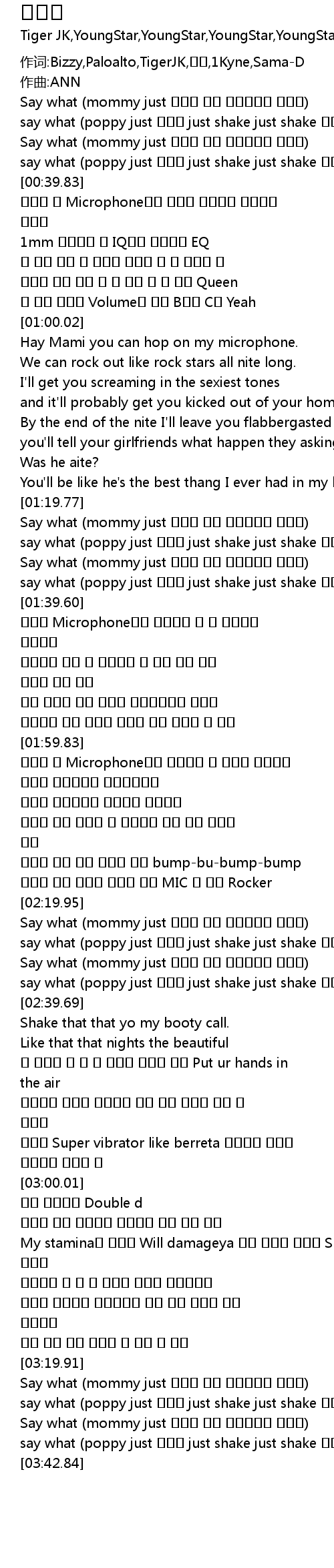 | [00:20.00] | Say what (mommy just 비벼대 부싯 부싯돌처럼 비벼대) |