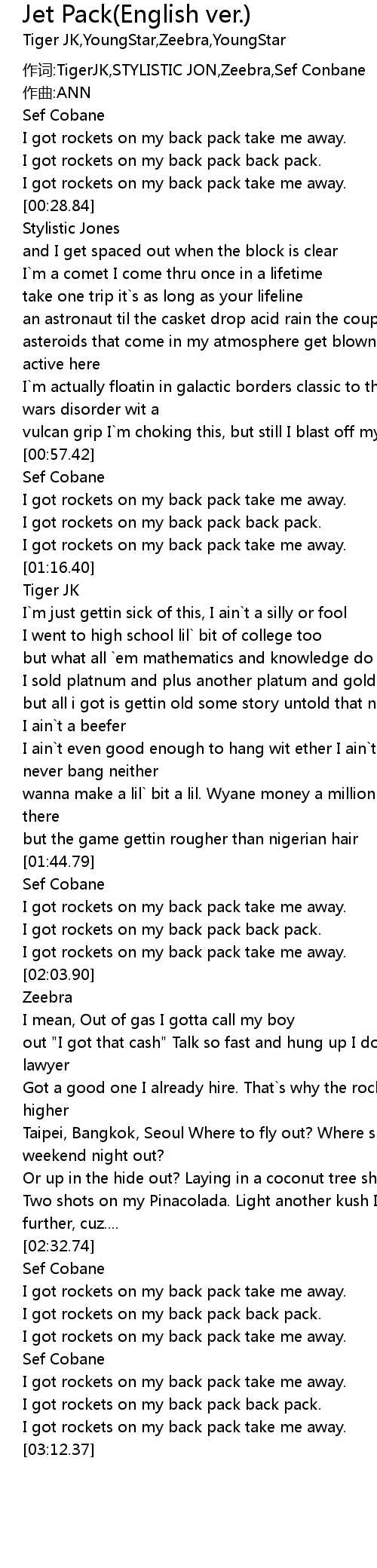 | [00:02.94] | zuò cí: TigerJK, STYLISTIC JON, Zeebra, Sef Conbane |