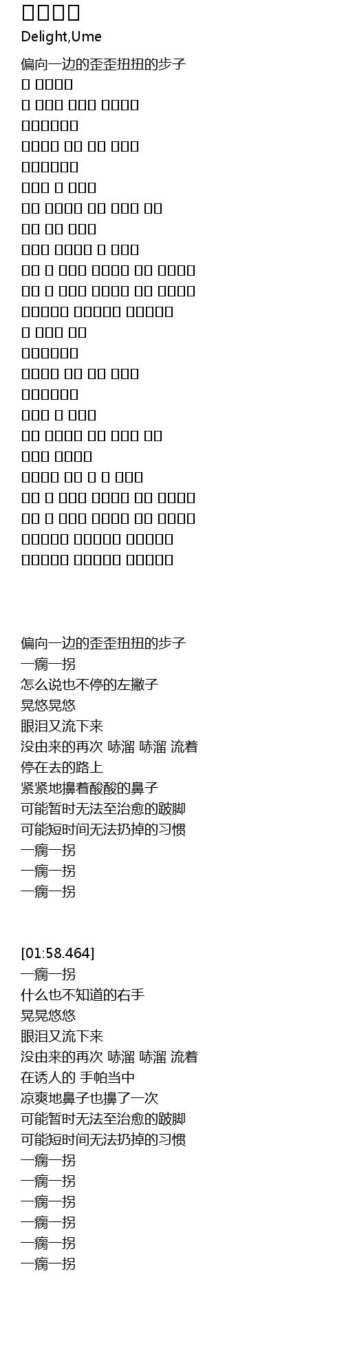| [02:40.512] | 可能暂时无法至治愈的跛脚 |