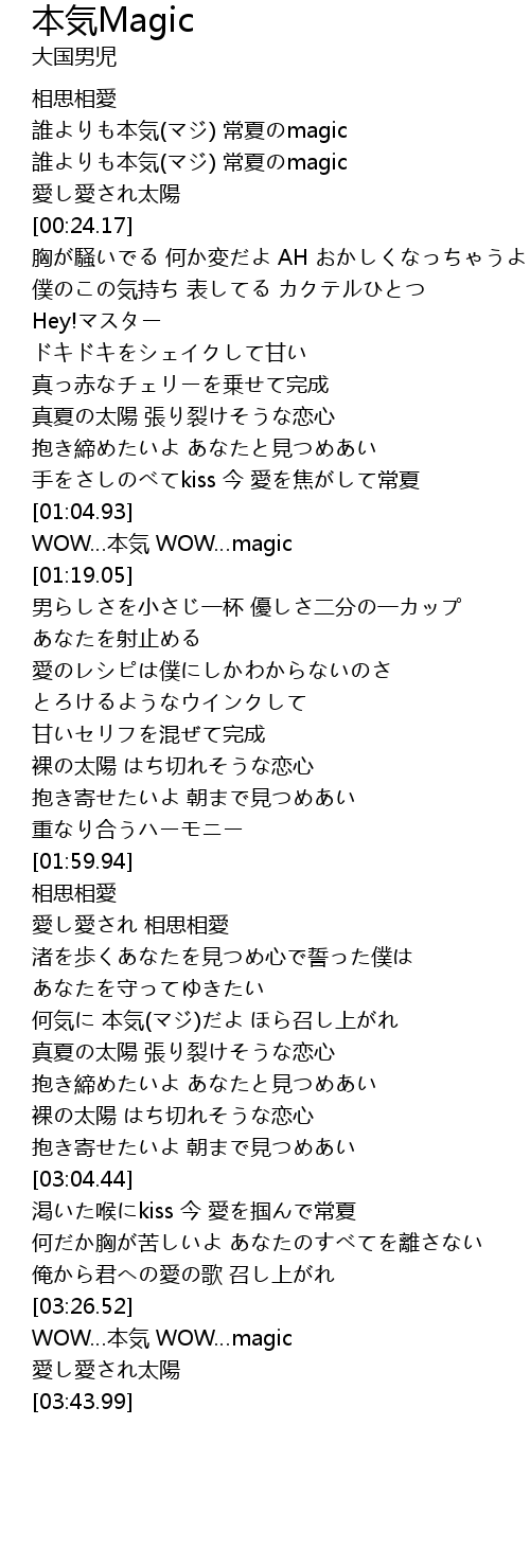 | [00:13.81] | 誰よりも本気(マジ) 常夏のmagic |