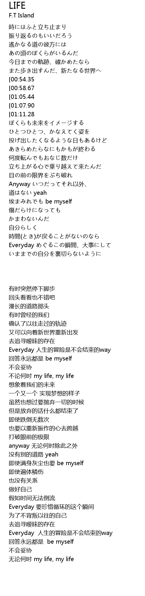 | [03:05.31][01:11.28] | どんな時もmy life, my life |