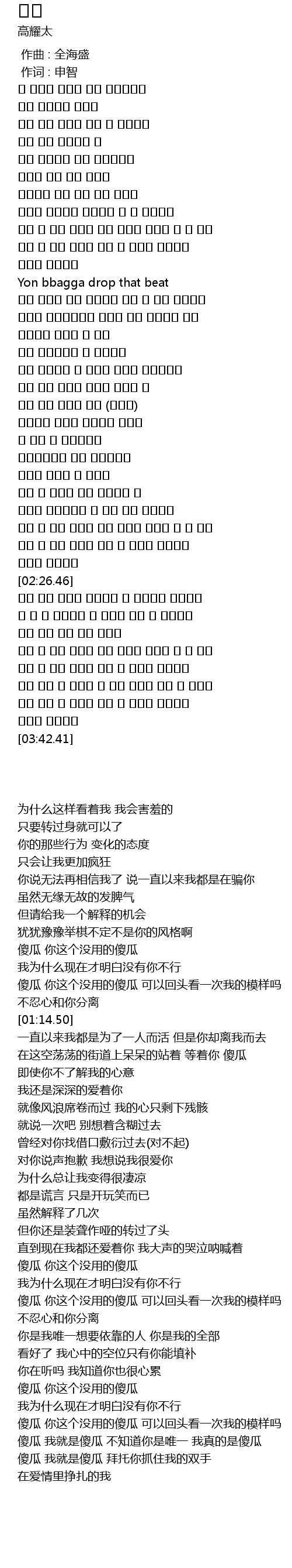 | [03:21.29] | 傻瓜 我就是傻瓜 不知道你是唯一 我真的是傻瓜 |
