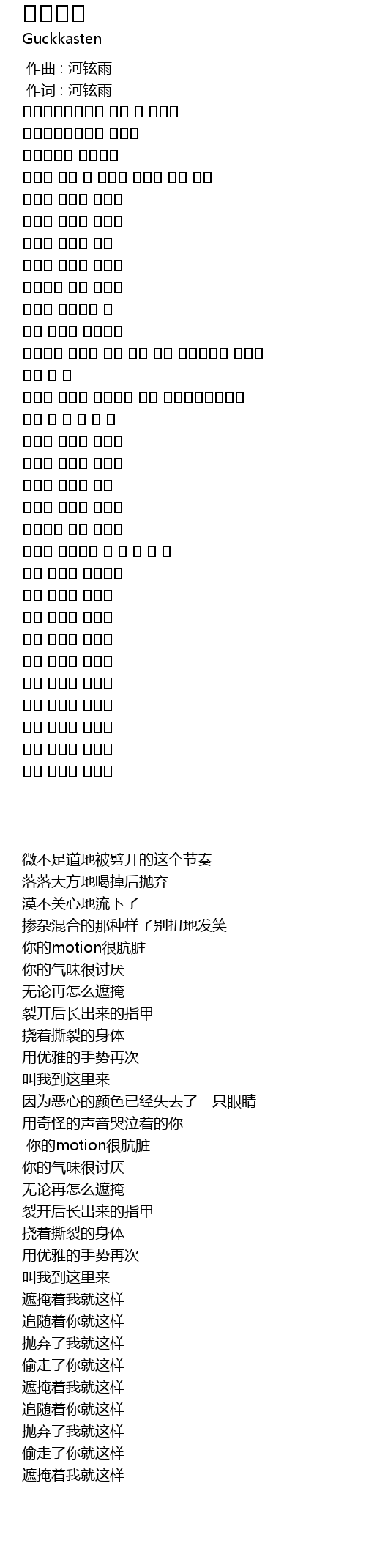 | [02:00.29] | 메스꺼운 색으로 이미 한쪽 눈을 잃어괴상한 소리로 우는 넌 넌 |