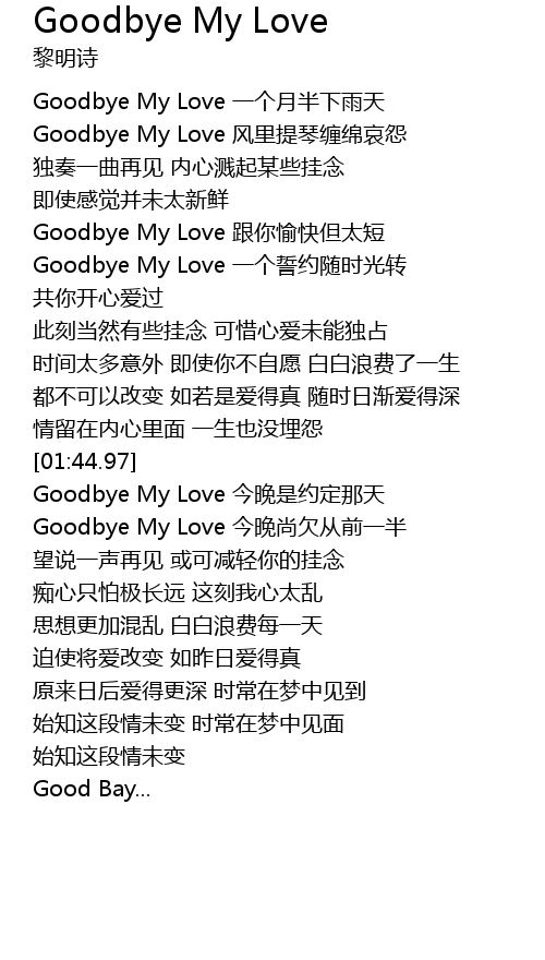 | [01:00.52] | Goodbye My Love yí gè shì yuē suí shí guāng zhuǎn |