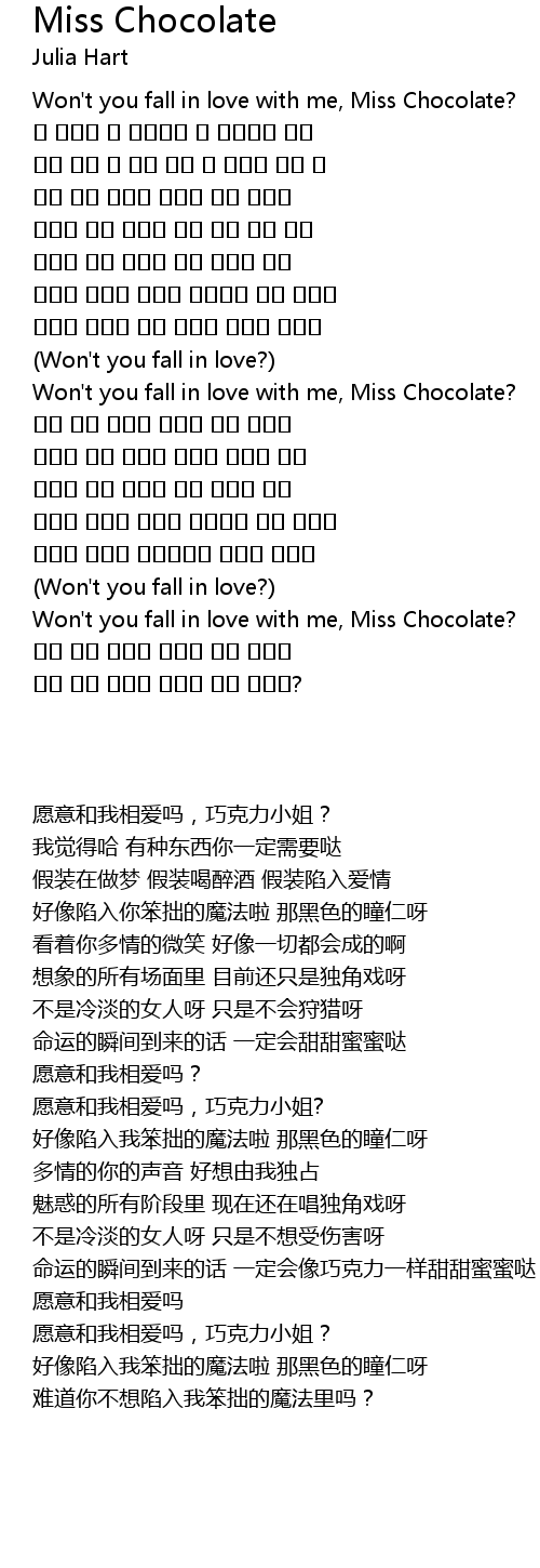 | [00:15.72] | Won't you fall in love with me, Miss Chocolate? |