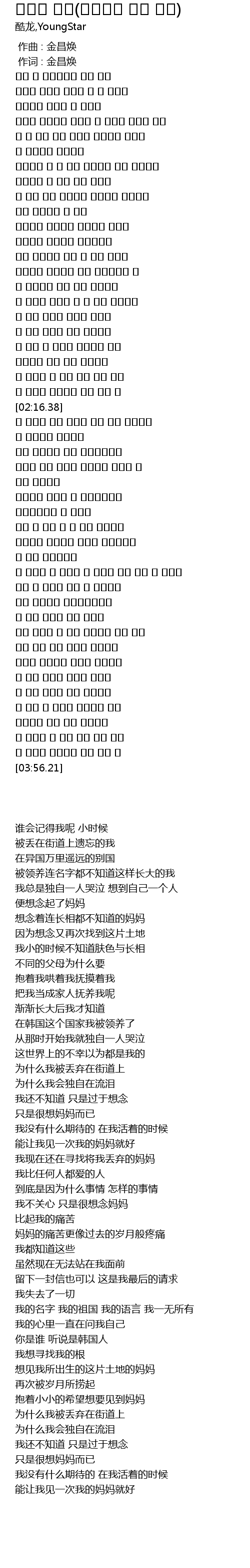 | [02:21.93] | 난 지금도 찾고 있어요 나를 버린 어머니를 |