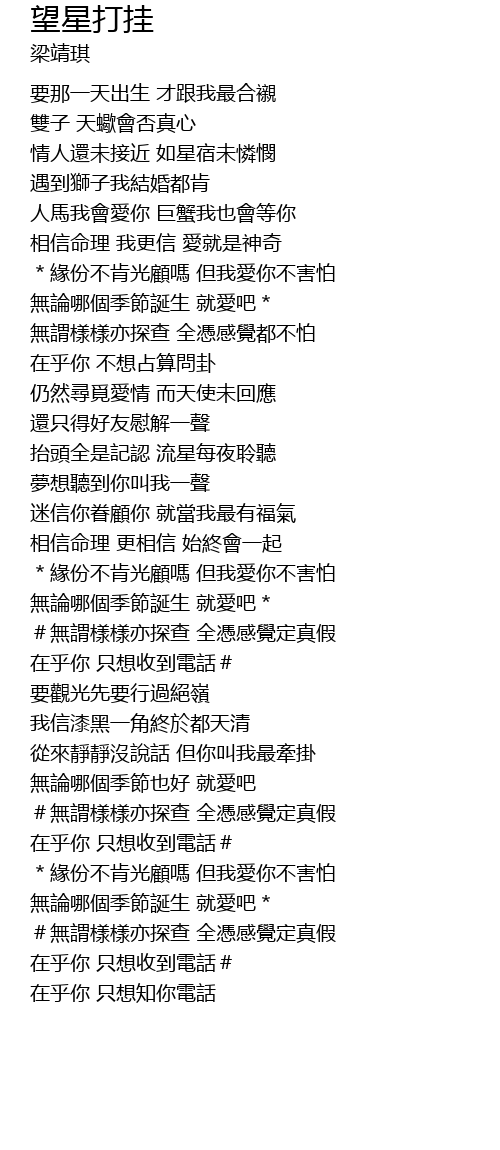 | [00:41.000] | 人馬我會愛你 巨蟹我也會等你 |