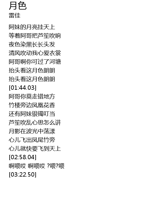 | [01:18.38] | 阿哥啊你可过了河塘 |