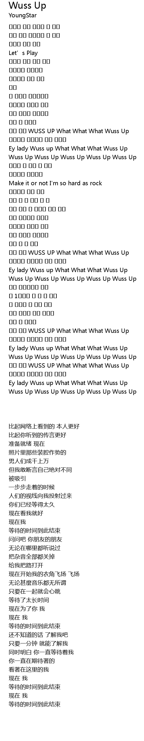 | [01:01.22] | 이제 내가 WUSS UP What What What Wuss Up |