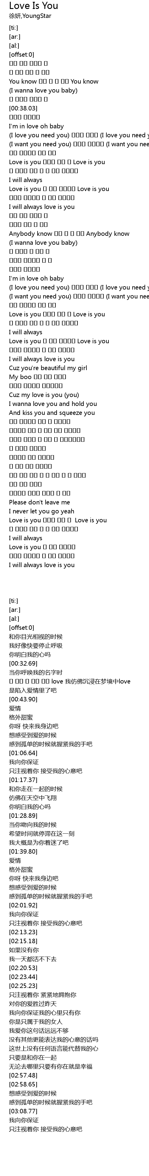 | [02:03.47] | Love is you 늘 너만 바라볼게 Love is you |