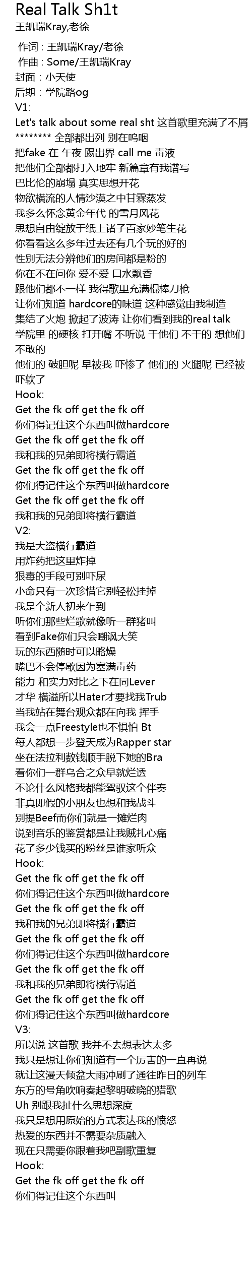 | [00:21.07] | Let' s talk about some real sht zhè shǒu gē lǐ chōng mǎn liǎo bù xiè |