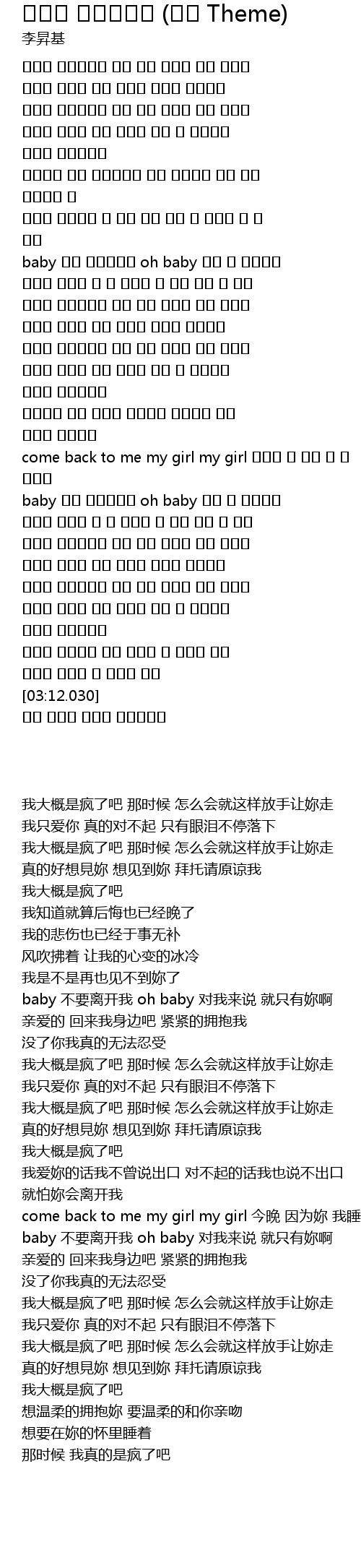 | [02:06.840] | baby 나를 떠나가지마 oh baby 나는 너 하나뿐야 |
