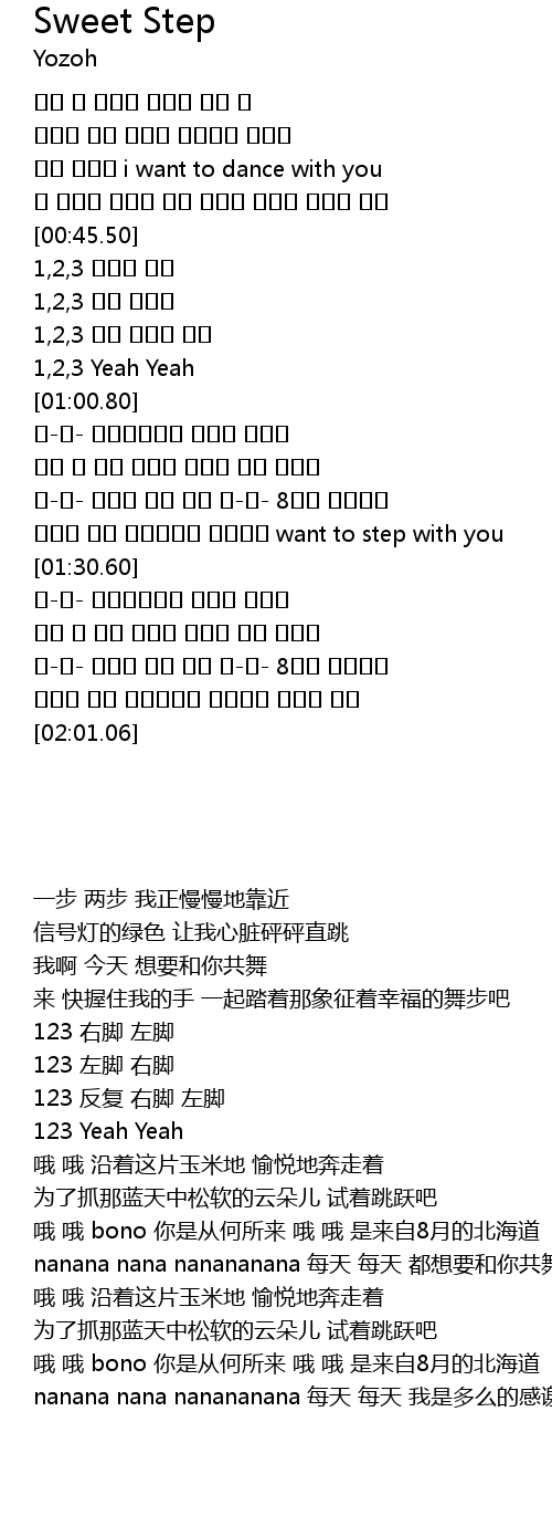 | [00:38.18] | 자 내손을 잡고서 함께 해줘요 행복한 우리의 스텝 |