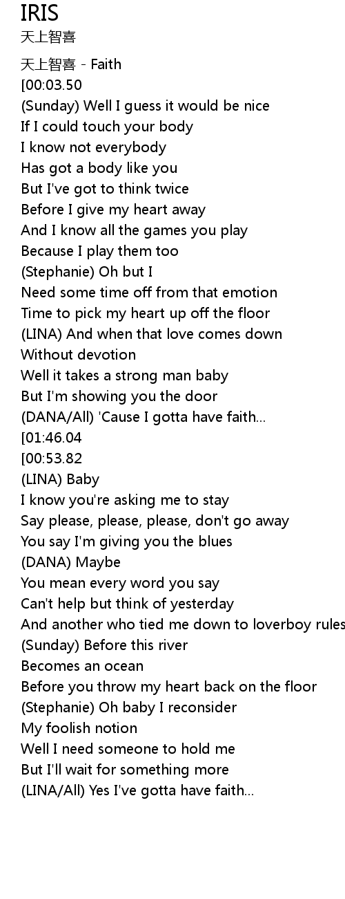 | [00:47.23] | (DANA/All) 'Cause I gotta have faith... |