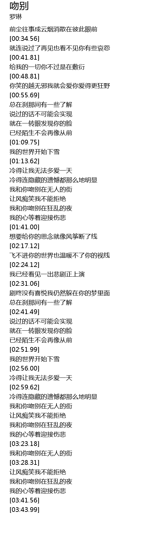 | [03:24.68] | wǒ hé nǐ wěn bié zài wú rén de jiē |