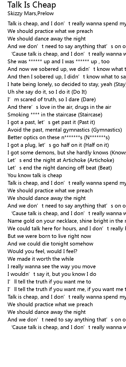 | [00:05.40] | Talk is cheap, and I don’t really wanna spend my time |