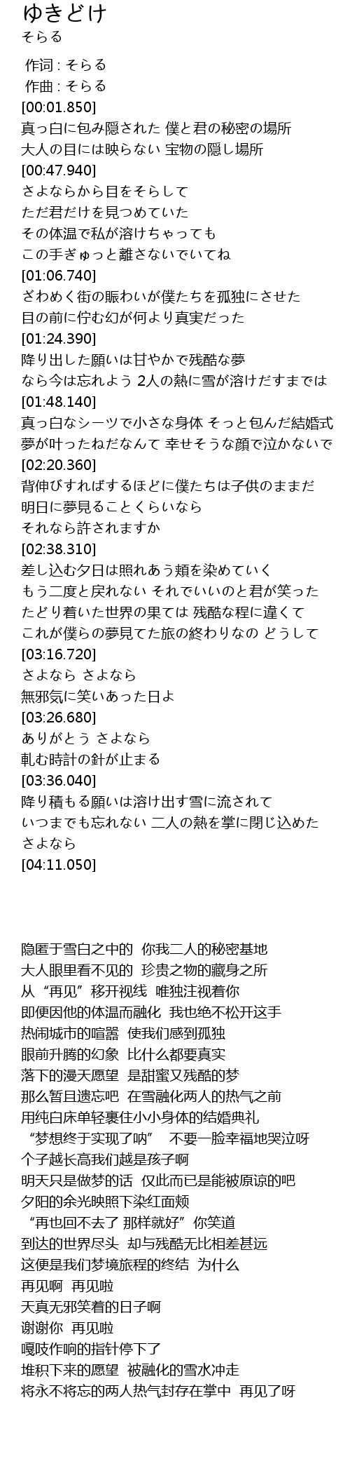 | [00:29.560] | 真っ白に包み隠された 僕と君の秘密の場所 |